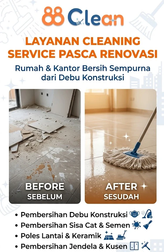 Rumah berantakan dan tidak beraturan setelah renovasi? Jangan pusing, Anda bisa memanggil jasa cleaning pasca renovasi di Jakarta Selatan dari 88 Clean untuk mengembalikan kebersihan hunian secara menyeluruh.